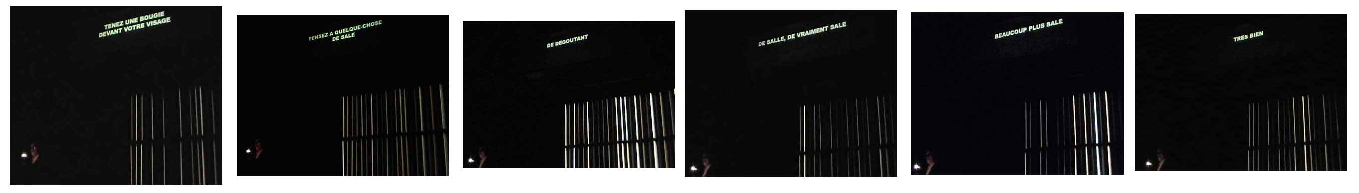 In a later version he's asked about halfway into the show to put on a pair of RADIO HEADPHONES. From this point on [keep scrolling right!] we don't hear what he's being told to do, we only see the result. However, the orders being given to him are projected in text form above him. This sets up a very illustrative process; it seems further away and easier to watch than before, and the atmosphere gradually becomes more removed and dream-like ... until we realise the projected text is starting to LIE about what he's being told to do. We're faced with having to reject the offer of being "taken away" as we wonder even more about what he's really being told to do.